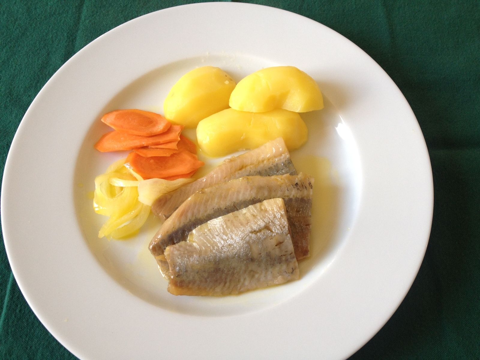 でもフランスの燻製ニシンも捨てたものではありません。これを大きめの容器に入れ、そこにスライスしたオニオンとニンジンを載せます。そして、月桂樹やタイム、コリアンダーの粒を散らし、最後にオリーヴ・オイル(私は菜種オイルを半分混ぜます)を素材がすっかり浸かるまで注ぎます。蓋をして、1週間ほど寝かせると美味しいマリネの出来上がりです。茹でたポテトとよく合います。主食にもどうぞ。